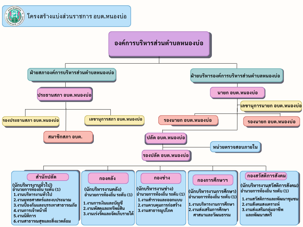 องค์การบริหารส่วนตำบลหนองบ่อได้จัดทำเอกสาร ผังโครงสร้างหน่วยงานภายในของ องค์การบริหารส่วนตำบลหนองบ่อ อำเภอเมือง จังหวัดอุบลราชธานี เพื่อประชาสัมพันธ์ แก่ประชาชนทราบโดยทั่วกัน