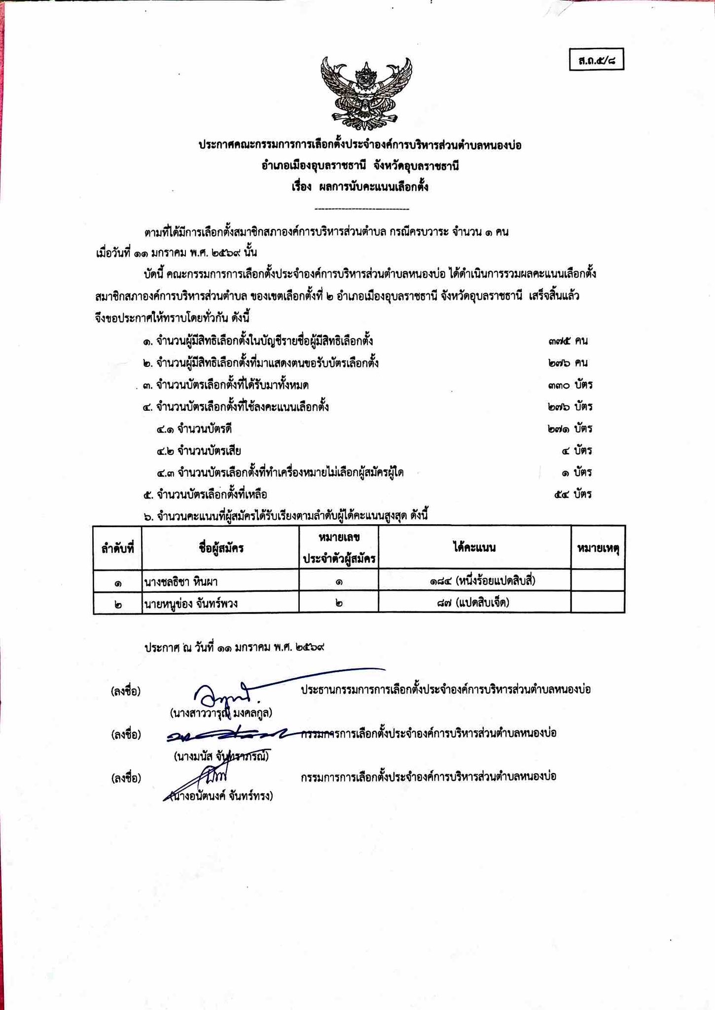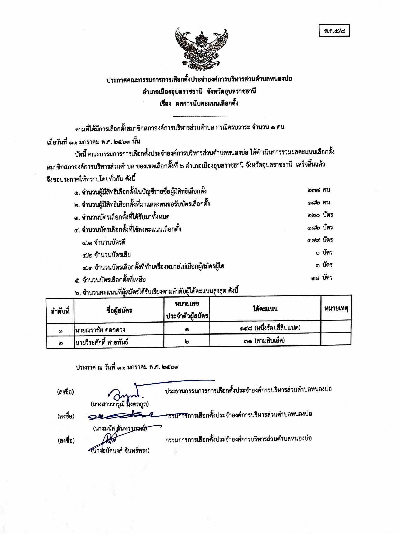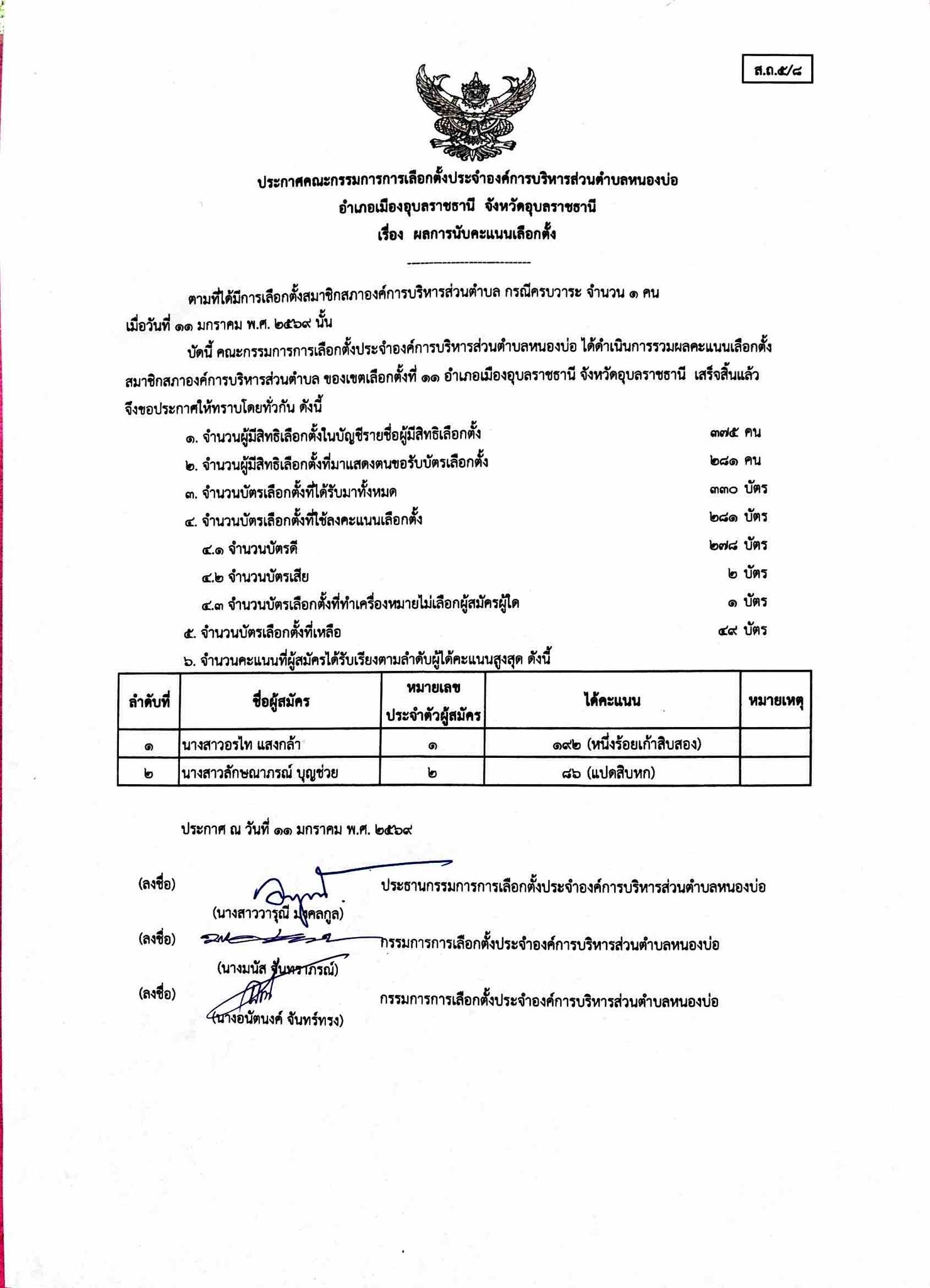 ประกาศคณะกรรมการการเลือกตั้งประจำองค์การบริหารส่วนตำบลหนองบ่อ เรื่อง ผลการนับคะแนนเลือกตั้ง