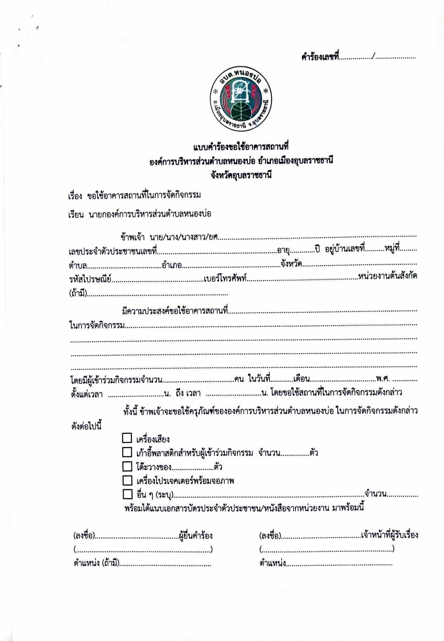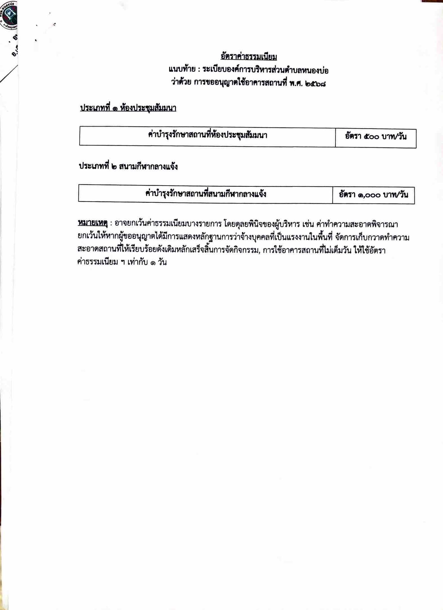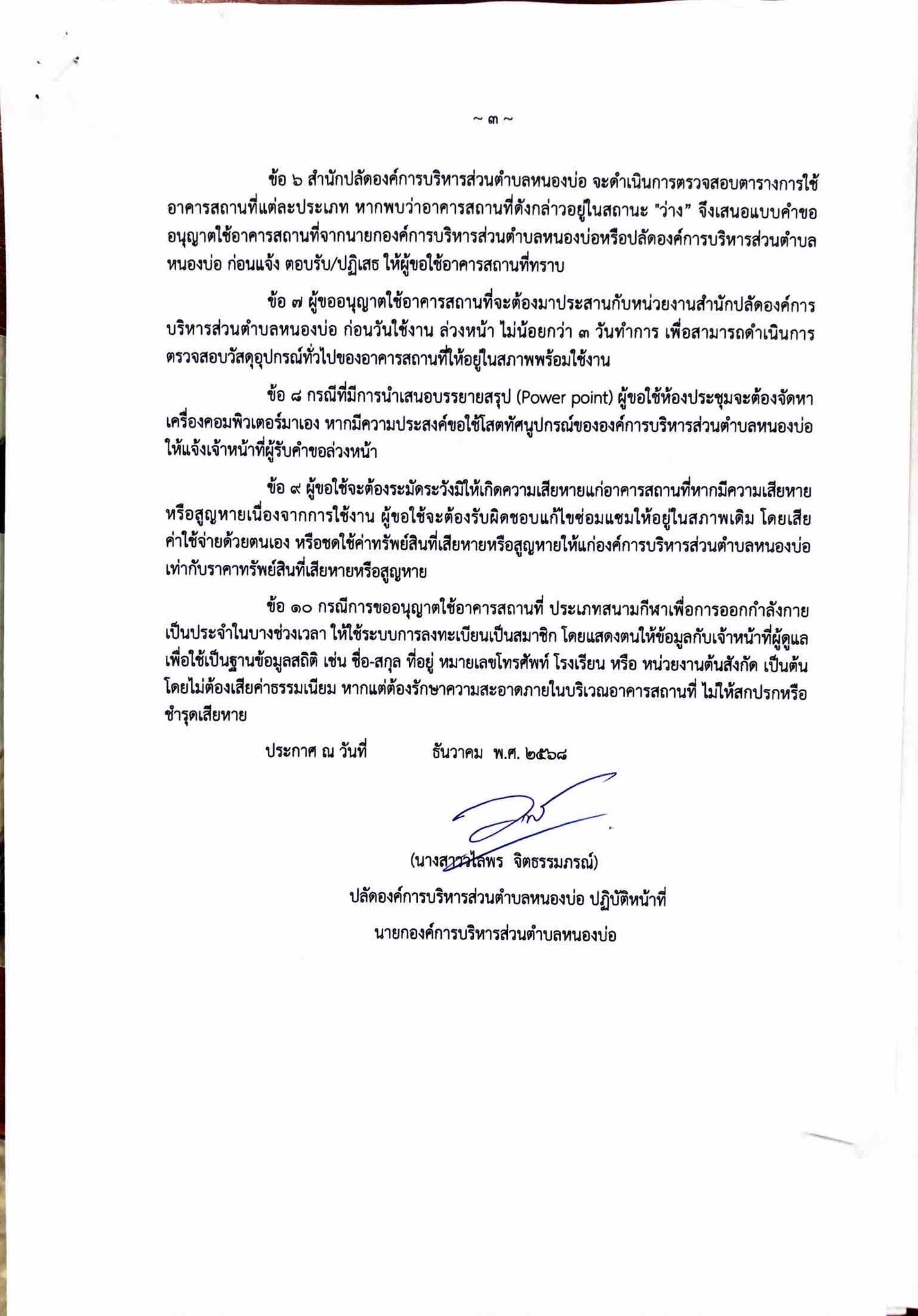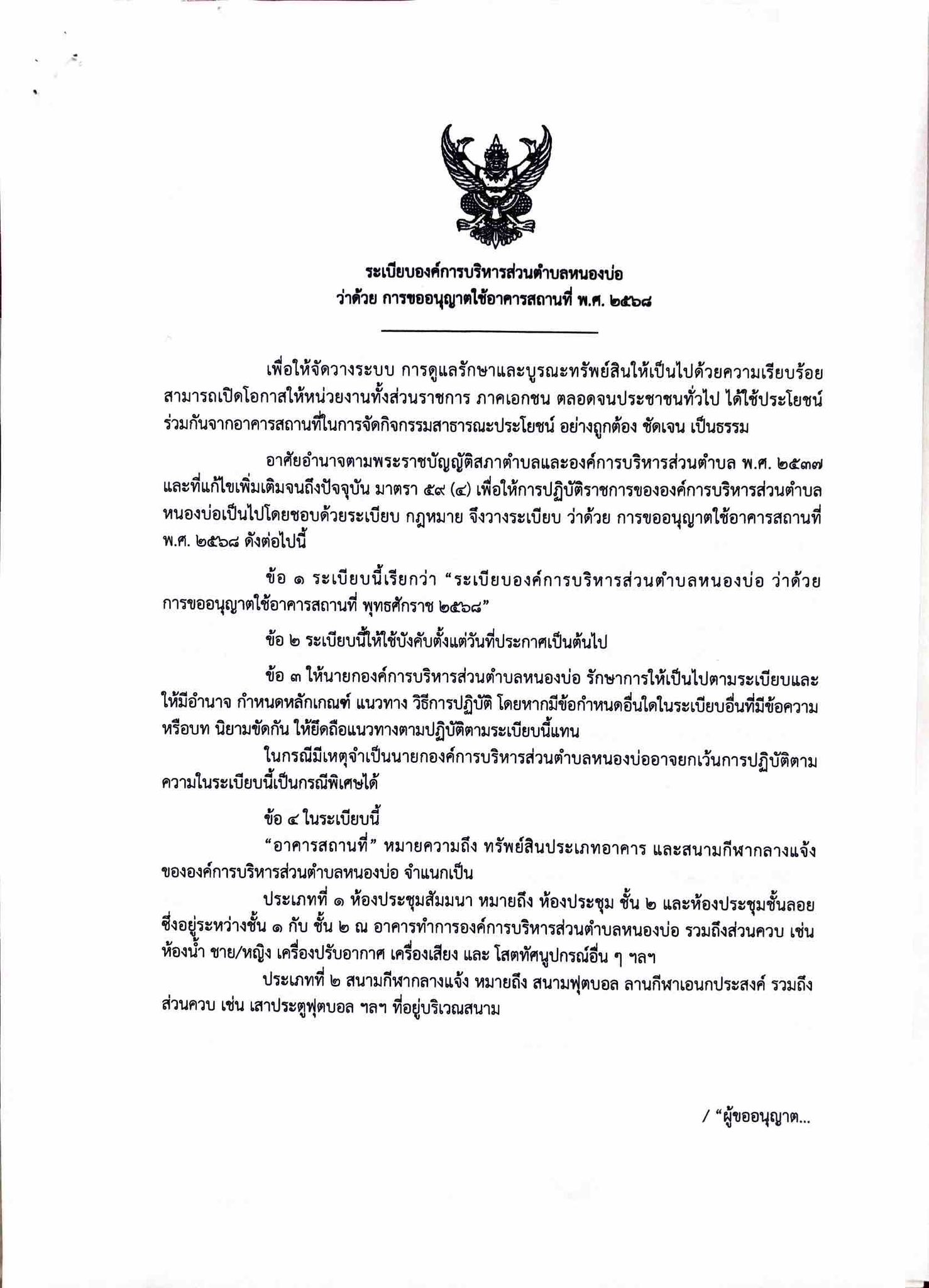 ประกาศองค์การบริหารส่วนตำบลหนองบ่อ ระเบียบองค์การบริหารส่วนจำบลหนองบ่อ ว่าด้วยการขออนุญาตใช้อาคารสถานที่ พ.ศ.2568