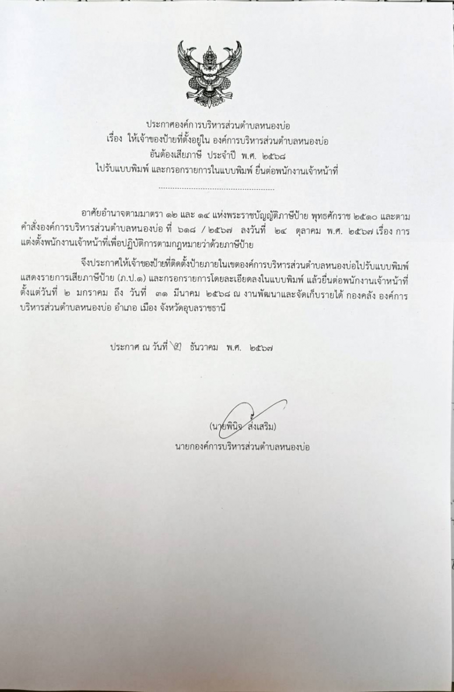 ประกาศองค์การบริหารส่วนตำบลหนองบ่อ เรื่อง ให้เจ้าของป้ายที่ตั้งใน องค์การบริหารส่วนตำบลหนองบ่อ อันต้องเสียภาษี ประจำปี พ.ศ. 2568