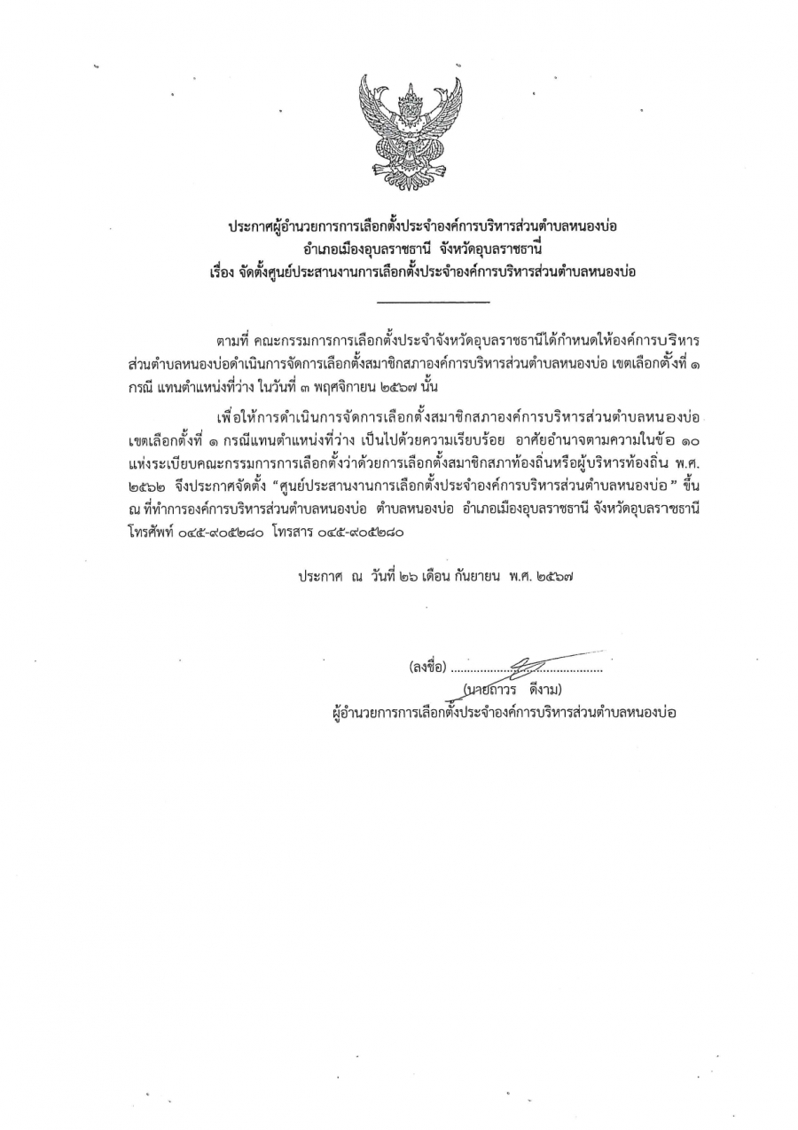 ประกาศผู้อำนวยการการเลือกตั้งประจำองค์การบริหารส่วนตำบลหนองบ่อ อำเภอเมืองอุบลราชธานี จังหวัดอุบลราชธานี