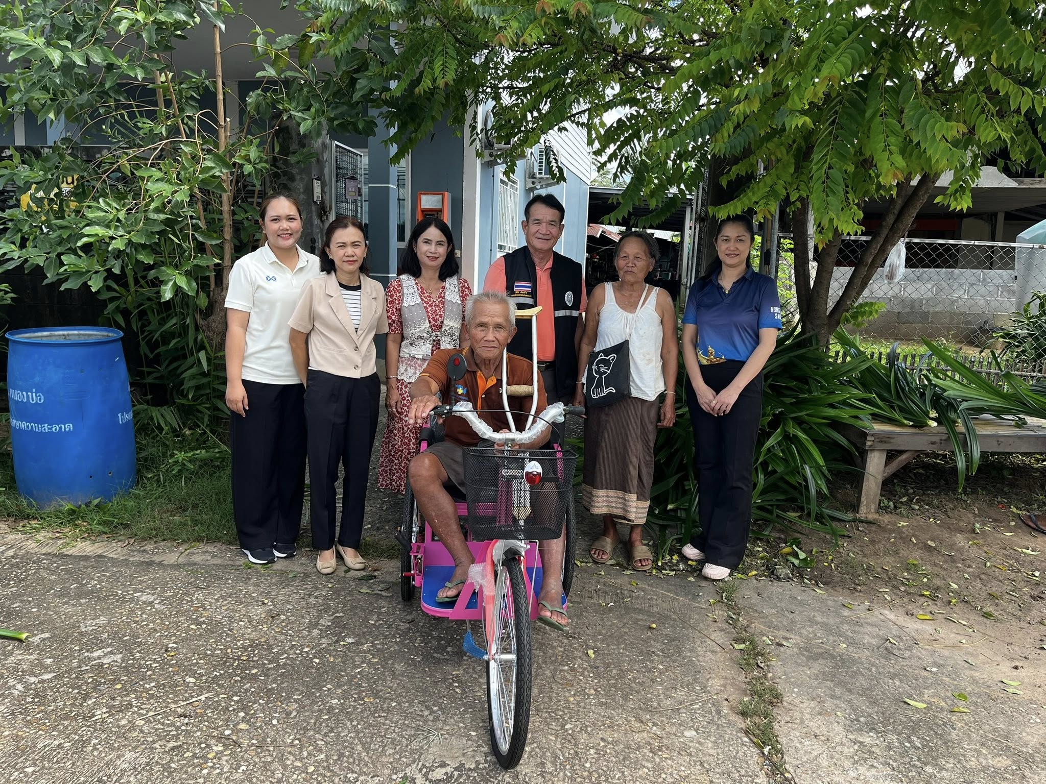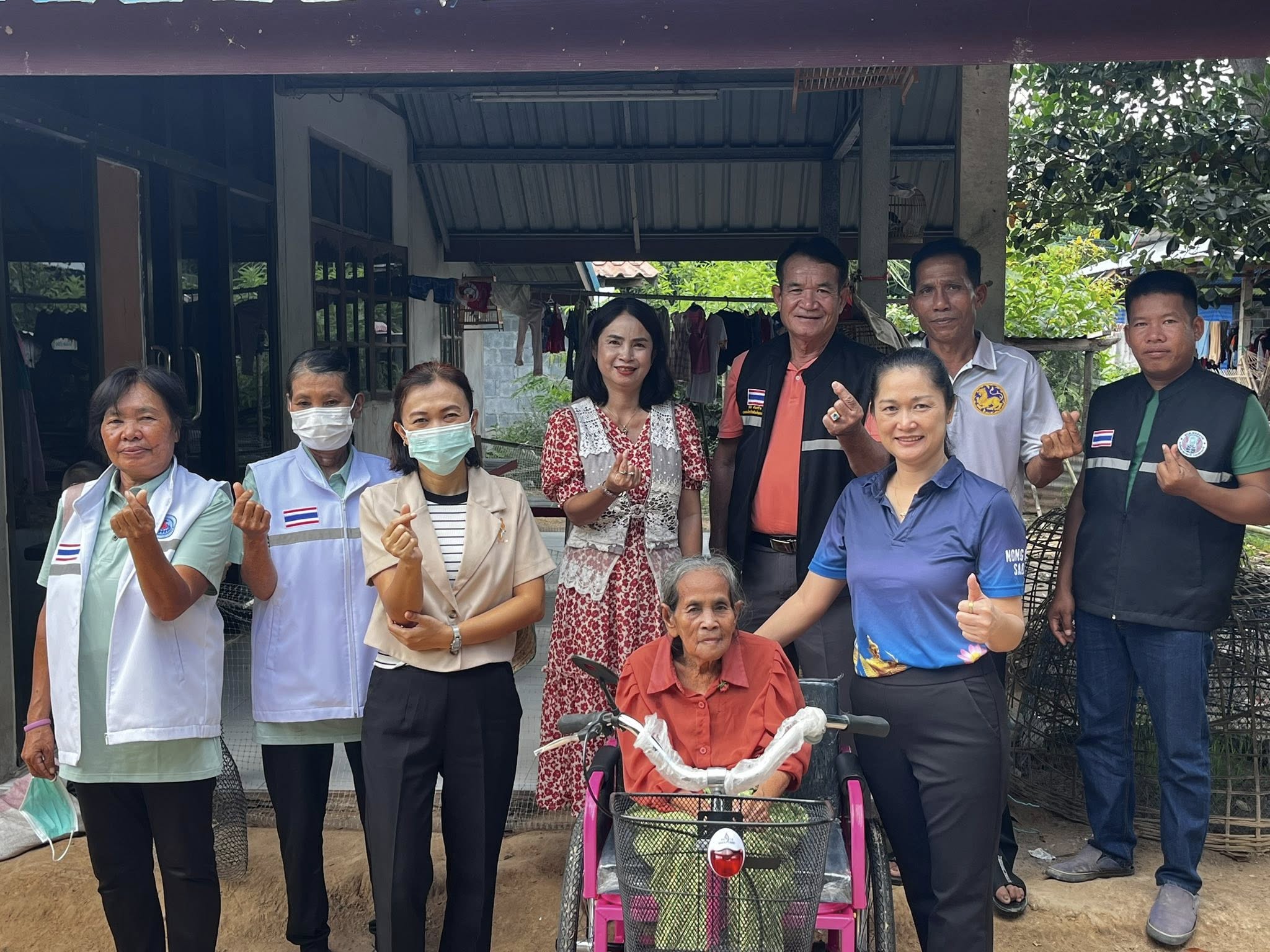 นายพินิจ ส่งเสริม นายกองค์การบริหารส่วนตำบลหนองบ่อ และนางสาววไลพร จิตธรรมภรณ์ ปลัดองค์การบริหารส่วนตำบลหนองบ่อ และผู้อำนวยการกองสวัสดิการสังคม ผู้นำชุมชนตำบลหนองบ่อ ลงพื้นที่มอบรถเข็นสามล้อโยกพระราชทาน