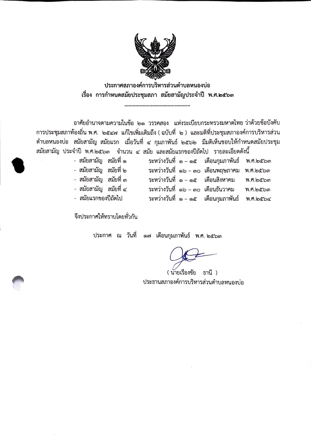 ประกาศสภาองค์การบริหารส่วนตำบลหนองบ่อ เรื่อง การกำหนดสมัยประชุมสภา ประจำปี พ.ศ.2563 วันอังคาร, 25 กุมภาพันธ์ 2563 10:50 Print Email ดาวน์โหลดเอกสาร ประกาศสภาองค์การบริหารส่วนตำบลหนองบ่อ เรื่อง การกำหนดสมัยประชุมสภา ประจำปี พ.ศ.2563 (0 Downloads) back to top