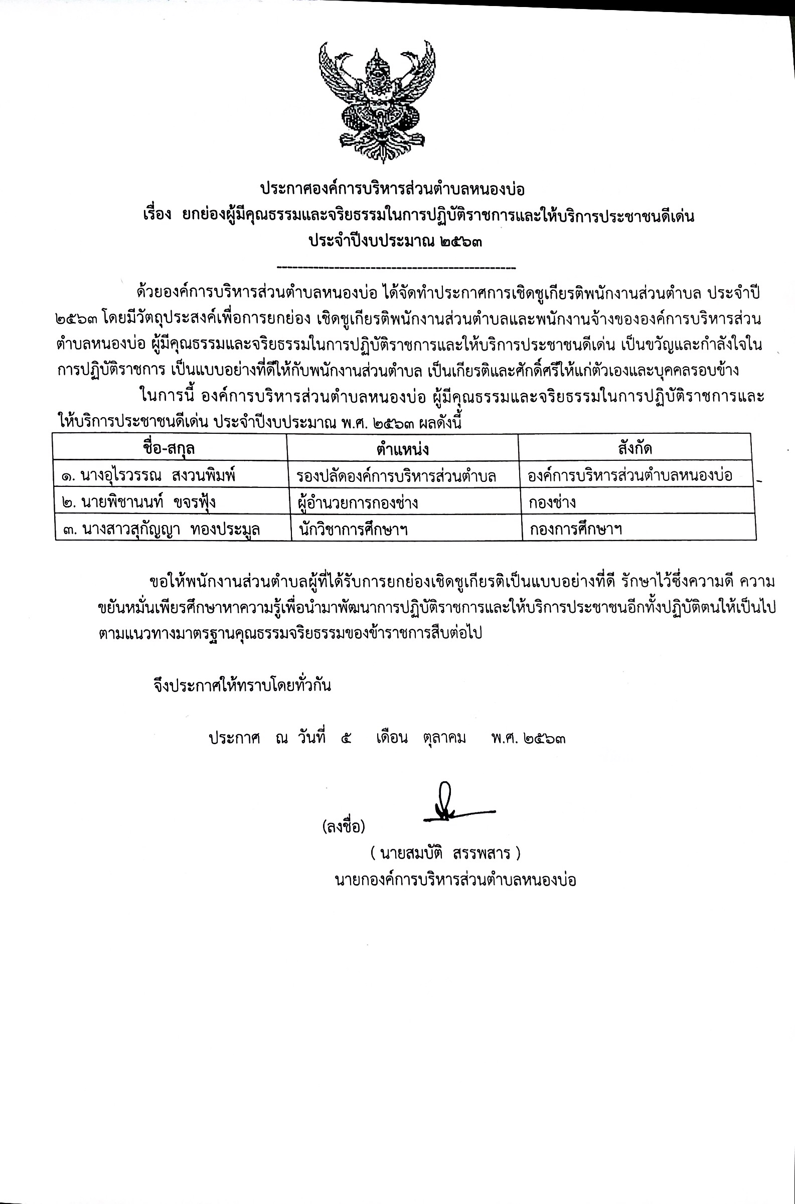 ประกาศองค์การบริหารส่วนตำบลหนองบ่อ เรื่องยกย่องคุณธรรมจริยธรรมในการปฏิบัติราชการและการให้บริการประชาชนดีเด่น ประจำปีงบประมาณ 2563 วันจันทร์, 05 ตุลาคม 2563 18:19 Print Email ดาวน์โหลดเอกสาร ประกาศองค์การบริหารส่วนตำบลหนองบ่อ เรื่องยกย่องคุณธรรมจริยธรรมในการปฏิบัติราชการและการให้บริการประชาชนดีเด่น ประจำปีงบประมาณ 2563 (0 Downloads) back to top