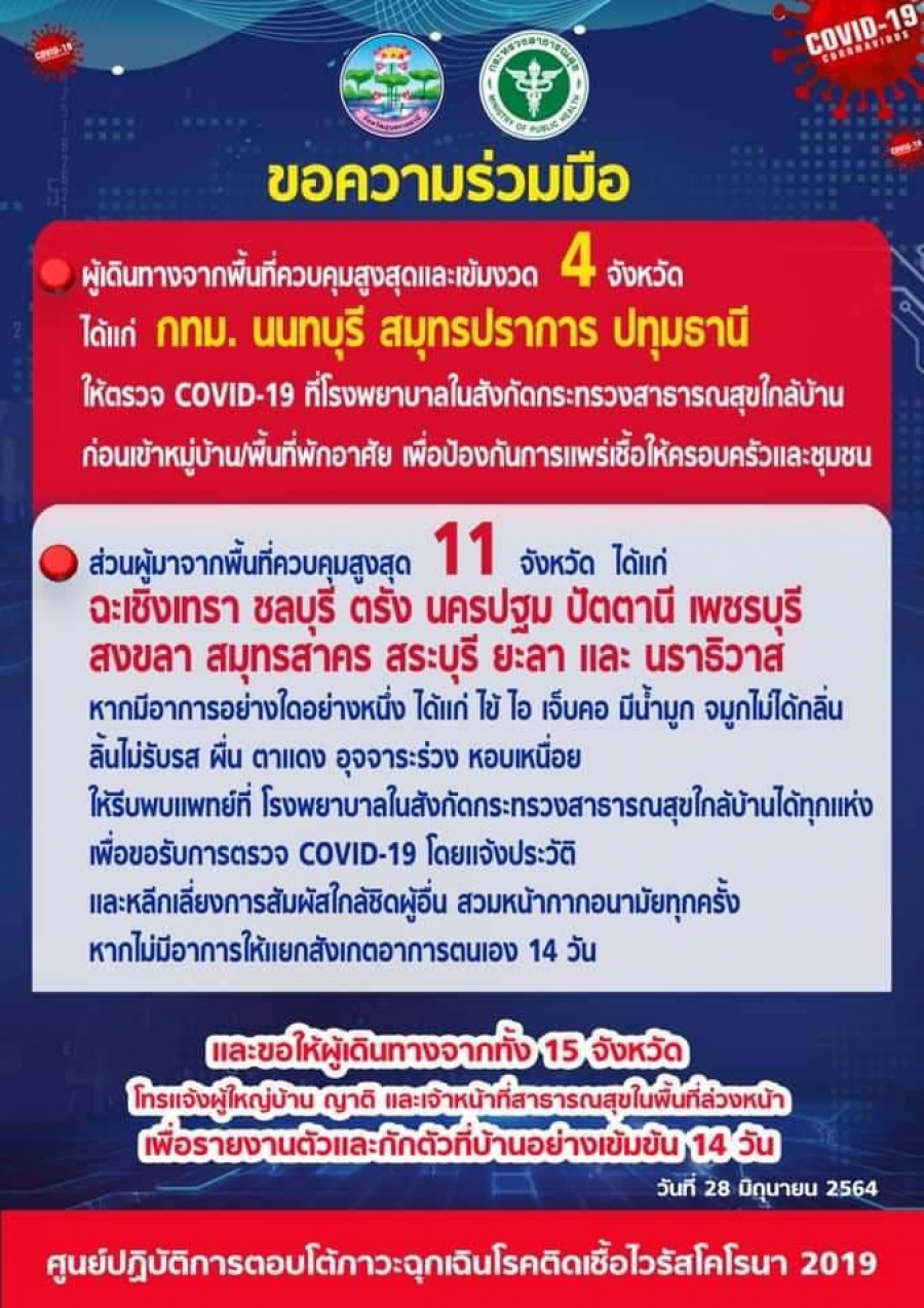 วันอังคาร, 29 มิถุนายน 2564 21:31ประชาสัมพันธ์ ...........ตั้งแต่ 28 มิย.64...ผู้เดินทางมาจาก